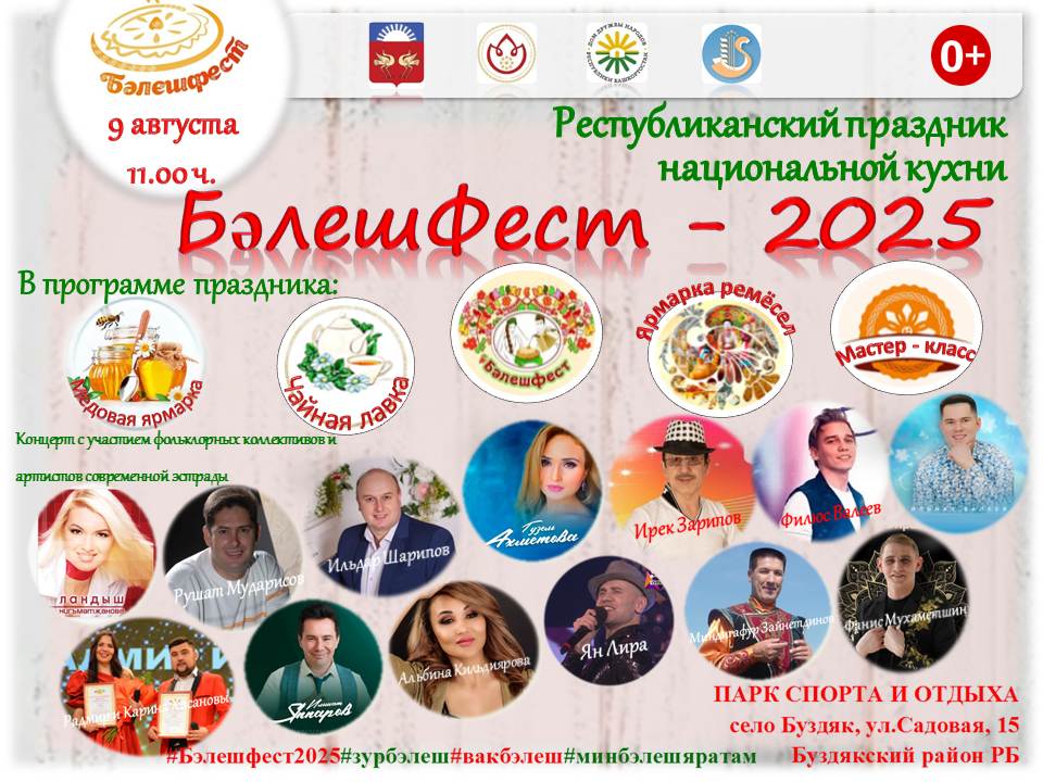 9 августа в Буздякском районе состоится брендовое мероприятие - фестиваль национальной кухни «Бэлешфест-2025» («Бәлеш бәйрәме»). Мероприятие проводится при поддержке Главы и Правительства Республики Башкортостан и направлен на сохранение, изучение и развитие национальной кухни народов Башкортостана, а также культурный обмен между ними.