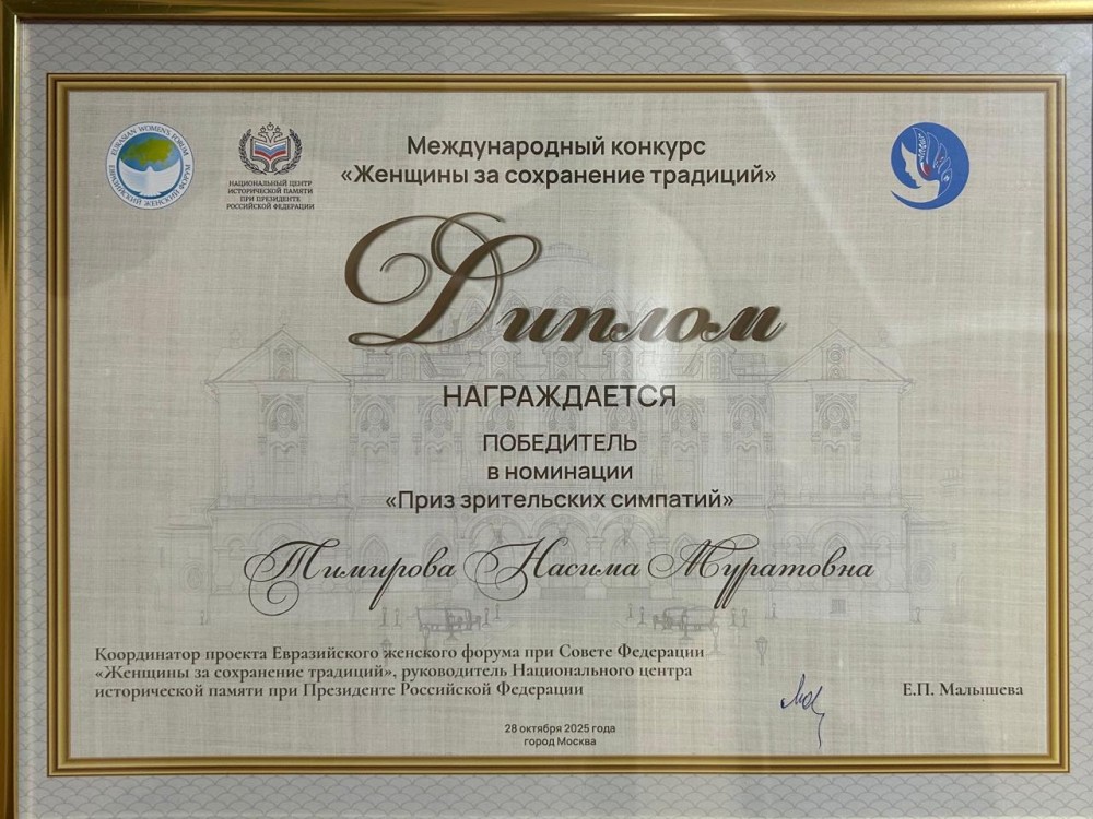 Среди лауреатов - башкирский фольклорный ансамбль «Ауаз» под руководством заслуженной артистки Республики Башкортостан Насимы Тимировой, удостоенной приза зрительских симпатий. Награду Насиме Муратовне вручила председатель Совета Евразийского женского форума Галина Карелова. «Рассказ о хранителях традиций в её семье и о том, как она вместе со своими родственниками и земляками их продолжает, невозможно было не отметить. Он стал безусловным фаворитом, набрав самое большое число лайков в соцсетях. Это пример мудрости, уважения к традициям и любви к людям», - подчеркнула сенатор.